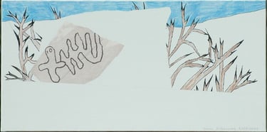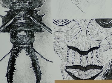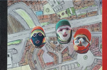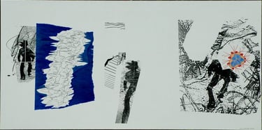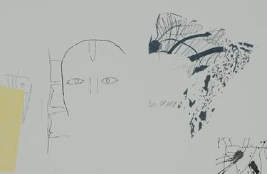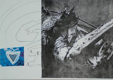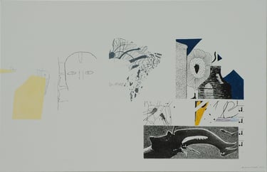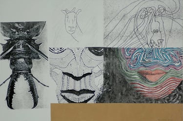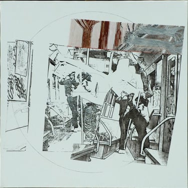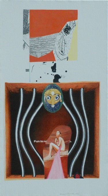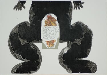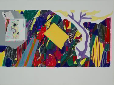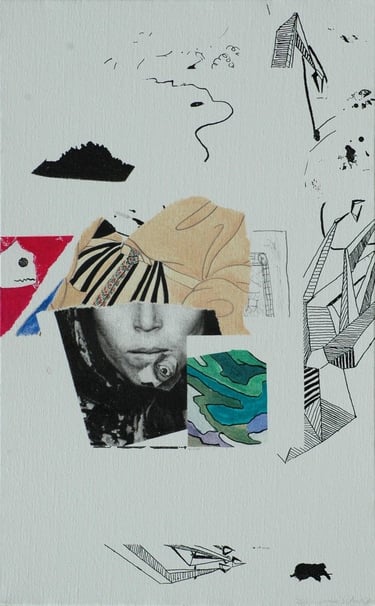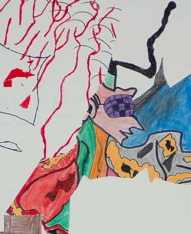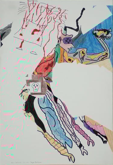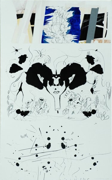 Les effets de trompe l’œil des différentes techniques graphiques telles que encre, mine de plomb, gouache, pastel, photo de magazine, feutre, crayons de couleur, sont tous réalisés à l’acrylique sur toile.